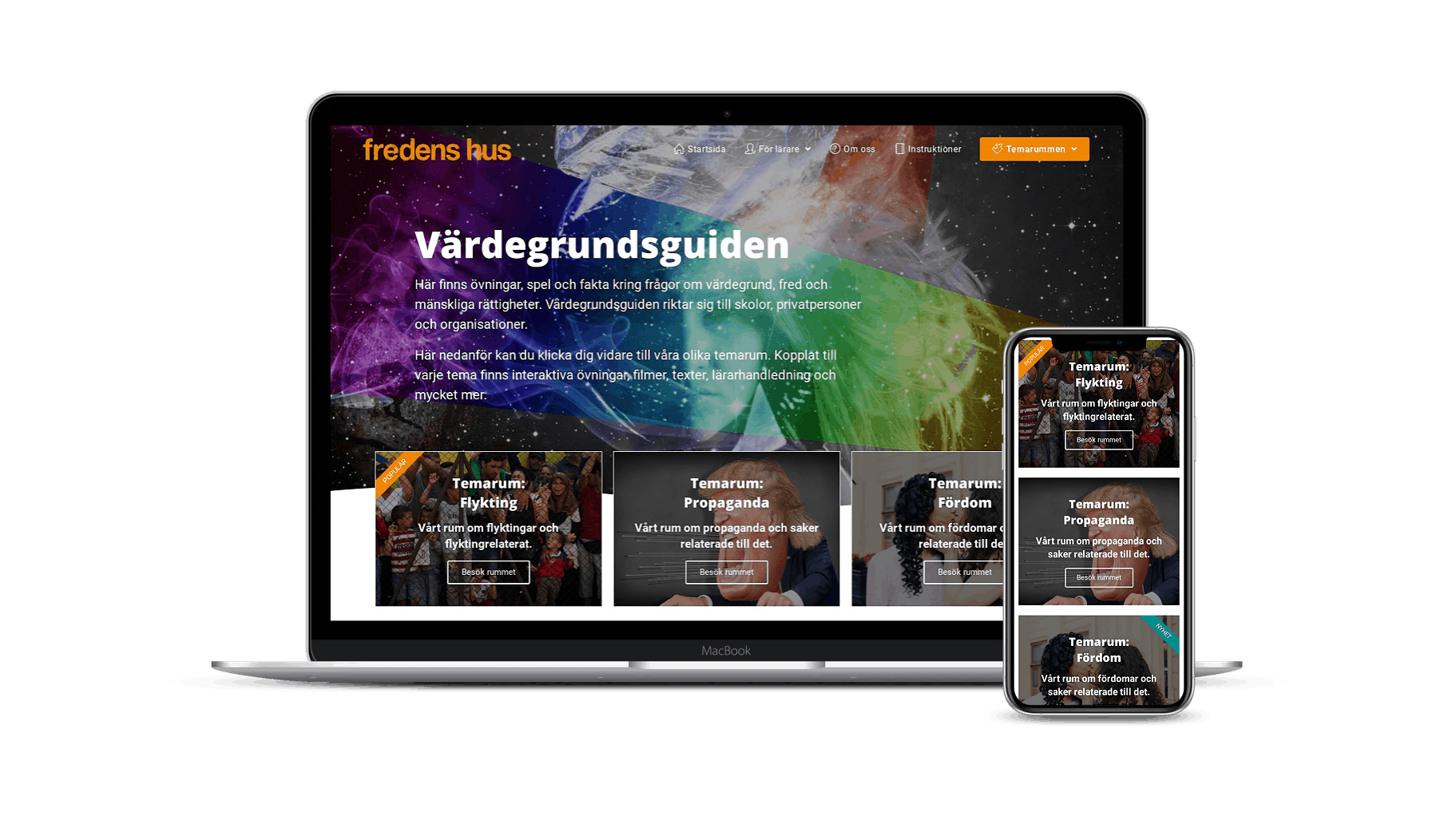 Vi skapade olika sektioner, ”Temarum” som behandlar olika ämnen. Varje temarum har en distinkt stil och innehåller olika filmklipp, diskussionsfrågor och övningar. Det blev en stimulerande blandning av interaktiva spel, quiz, bildspel, m.m. som man tar sig igenom.